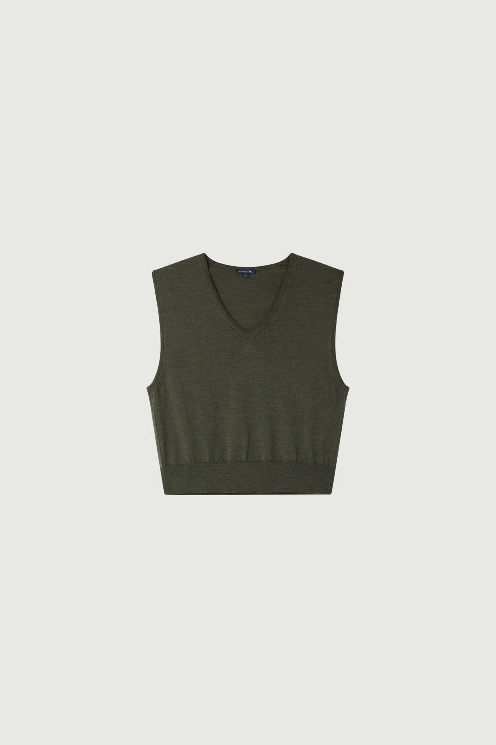 SONIA is a fine merino wool sleeveless jumper, a wardrobe staple we can always rely on. Although simple at first glance, it can be layered over any outfit or worn directly against the skin. The fine, supple merino wool comes alive with its deep khaki hue.